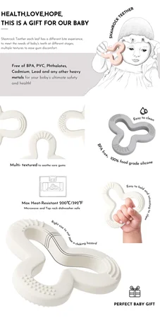 - طراحی سبک و جذاب دندان گیر SHAMROCK TEETHER HeorSheبا طراحی سبک و مناسب به دست کوچک نوزاد شما مناسب است، به عبارت دیگر، بسیار آسان برای گرفتن و مکیدن است. نوزاد شما به راحتی میتواند آن را برای مدت طولانی بدون از دست دادن گیر نگه دارد. طراحی منحصر به فرد و چالهای در داخل دندان گیر، همچنین نوزاد را آرامش داده و هماهنگی چشم و دست را بهبود میبخشد!