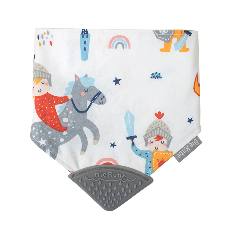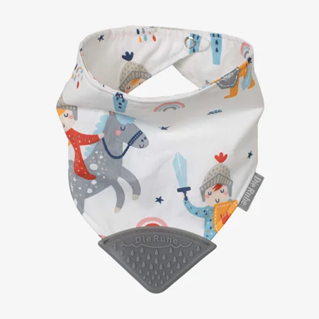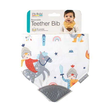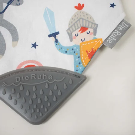دندان درآوردن برای نوزادان با خارش و التهاب همراه است. تقریبا از چهار ماهگی مقدار آب دهان نوزاد بیشتر می شود و اجسام را به دهان می برد تا درد و خارش لثه هایش را برطرف کند. دندان گیر سیلیکونی دی روحه، ساخته شده از سیلیکون فودگرید، مناسب دهان نوزاد طراحی شده است. پیشبندی بودن آن از افتادن دندانگیر بر روی زمین و آلوده شدن آن جلوگیری می کند. همچنین لایه ی جاذب مایعات که در این پیشبند قرار داده شده آب دهان نوزاد را به خود جذب می کند و مانع خیس شدن لباس نوزاد می شود. دندان گیر پیشبندی طرح شوالیه کوچولو دی روحه Die Ruhe دو رو است و لایه های بیرونی پیشبند، پارچه ای از جنس الیاف صد در صد پنبه ایست که برای نوزاد ایجاد حساسیت نمی کند. اتصال پیشبند به صورتی طراحی شده که برای نوزاد تا دوسالگی قابل استفاده است.