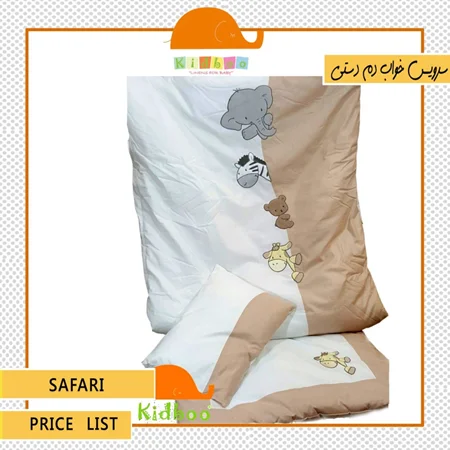 سرویس دم دستی 5 تکه کیدبو مدل Safari یکی از بامزه ترین مدلهای کیدبو برای کودکان دختر و پسر با پس زمینه قهوه ای سفید و طرح حیوانات می باشد.این سرویس خواب تنها سرویس خواب آنتی باکتریال کودک می باشد. جنس رویه از کتان بسیار نرم و زیبا تولید شده است.جنس تمام اقلام این محصول از کتان 100 پنبه با تراکم می باشد. که بدون حساسیت و مواد مضر شیمیایی تولید شده است. این ست به دلیل پنبه ای بودن و طبیعی بودن فقط قابلیت شستشو با دست دارد.
