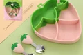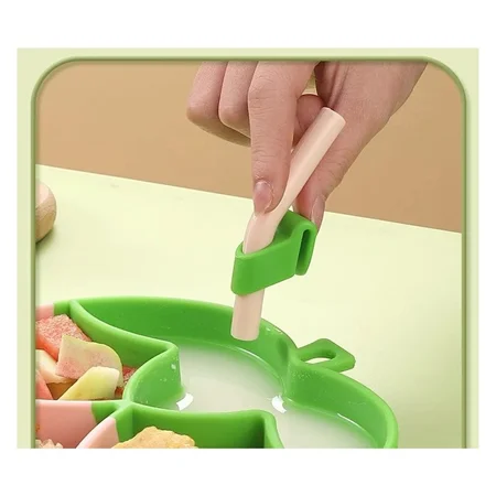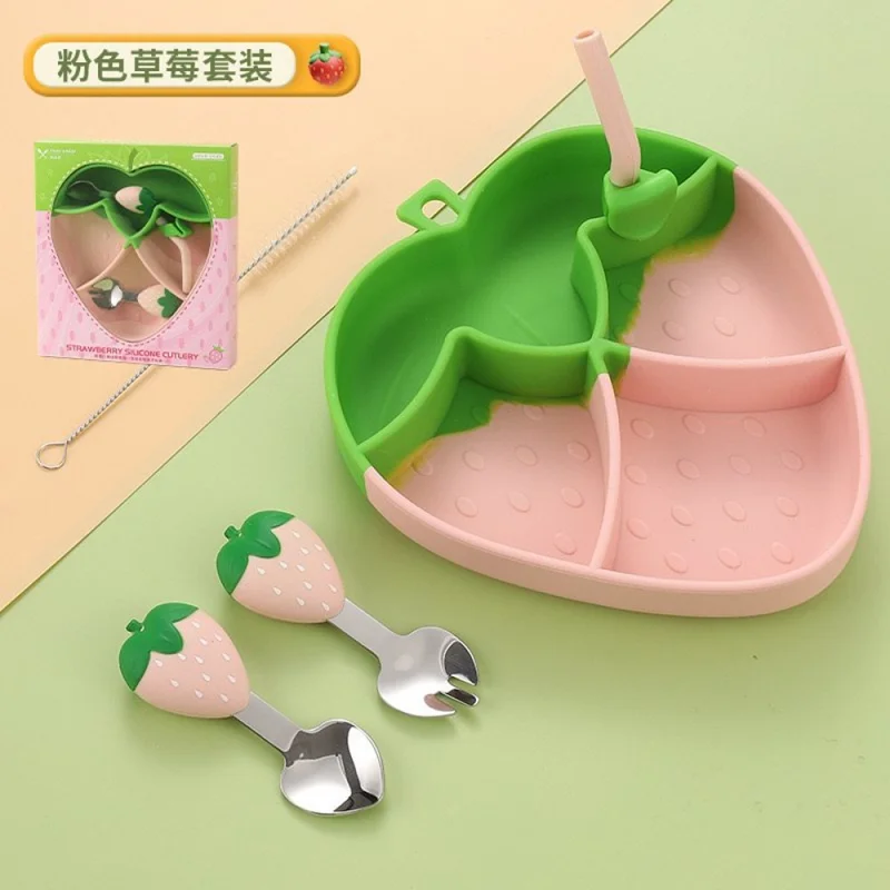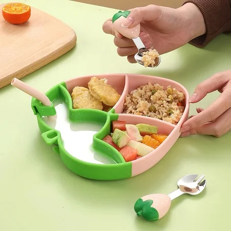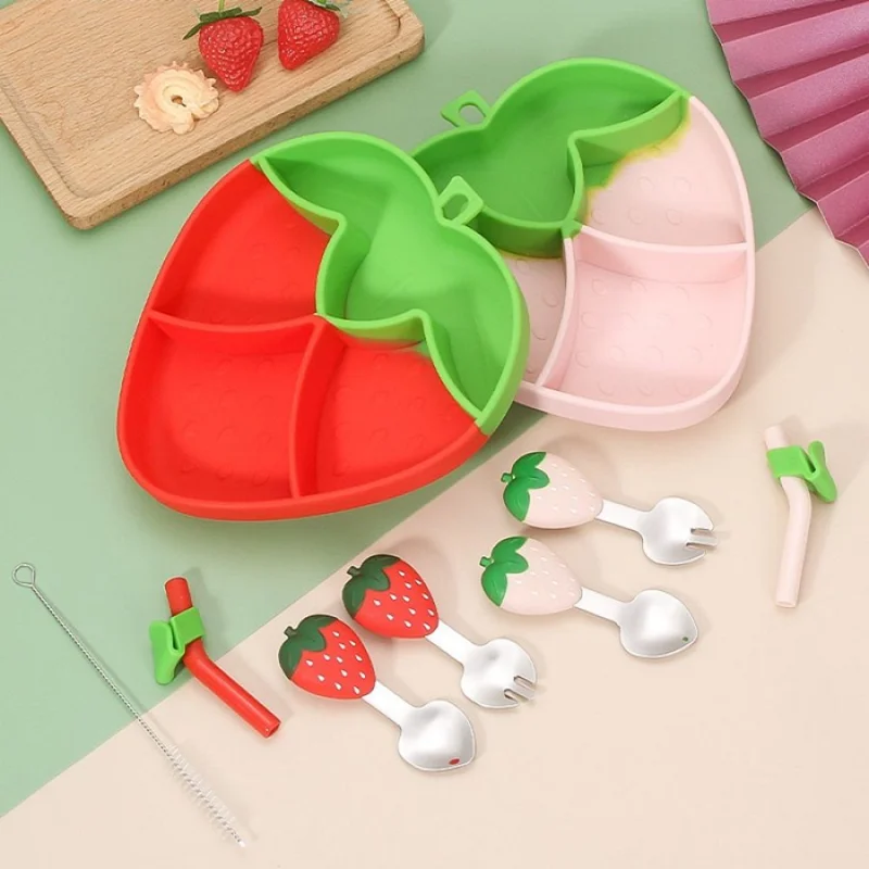 شش ماهگی زمانی مهم در مراحل رشد کودک دلبند شما محسوب می شود. زمانی که کودک غذا خوردن را آغاز می کند. در کنار شیر مادر تغذیه کودک با غذای کمکی آغاز می شود. استفاده از ظروف غذاخوری با کیفیت تاثیر مطلوبی بر این روند می گذارد . ست غذاخوری سیلیکونی طرح توت فرنگی شامل : بشقاب تقسیم بندی شده سیلیکونی - دارای قاشق و چنگال استیل با طراحی خاص -دارای نی سیلیکونی به همراه گیره برای نوشیدن مایعات است.