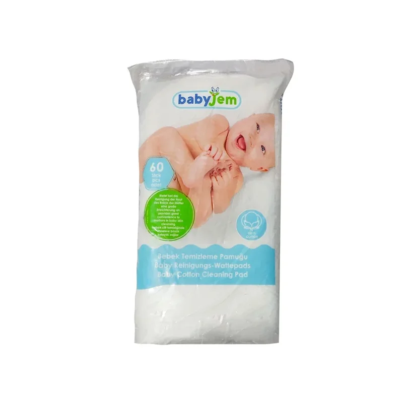 پد پنبه ای بهداشتی 60 عددی بیبی جم دارای بافت بسیار نرم است از 100% پنبه خالص ساخته شده است و فاقد عطر و رنگ طبیعی است. از نظر پوست تست شده است و به پوست حساس کودک شما آسیبی نمی رساند. برای پوست حساس کودکان به طور ویژه عمل می کند.این نرم بودن ِ این محصول باعث می شود که موقع کشیدن پد روی پوست کودک بر روی آن اثر سوء به وجود نیاید؛ مثلا باعث ایجاد زخم نشود، آن را تحریک یا قرمز و دچار خارش نکند. بسته بندی بهداشتی دارد و پس از بیرون آوردن پنبه به مقدار لازم می توانید آن را با محکم کردن دهانه آن با نخ برای استفاده بعدی نگهداری کنید.پد پنبه ای پاک کننده نوزاد بیبی جم را با آب جوشیده و ولرم خیس کنید. به آرامی بدن کودک خود را تمیز کنید. در صورت لزوم همین روند را تکرار کنید. محصولی طبیعی است که به پوست کودک آسیبی وارد نمی کند.