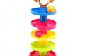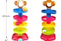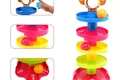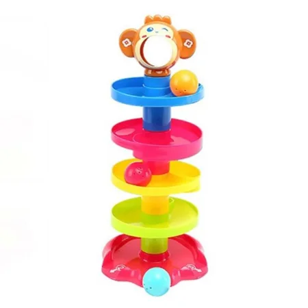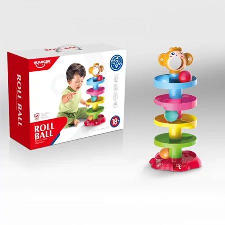 این اسباب بازی دارای یک بدنه شبیه سرسره ی چرخشی است. 3 عدد توپ با رنگ های مختلف دارد.وقتی کودک توپ ها را از دهان میمون داخل کند، توپ ها چرخیده و از پایین برج بیرون می آیند.سطح شیب دار لایه ها به خروج سریع تر توپ ها کمک می کنند.پایین این اسباب بازی 3 خروجی برای توپ است که اعداد یک تا سه روی آن نوشته شده است.اگر کودک عددها را بشناسد می توانید از او درخواست کنید تا توپ خارج شده از عدد مربوطه را به شما دهد.در ساخت این محصول از هیچ ماده ی مضر و خطرناکی مانند بیسفنول آ BPA استفاده نشده است.لبه های این محصول هیچ گونه تیزی و بُرندگی ندارند.مناسب برای بازی به صورت تکی یا گروهی است .به دلیل داشتن بخش های کوچک، این محصول برای نوزادان کوچکتر مناسب نیست.بازی با این اسباب بازی سبب ارتقای قدرت هماهنگی دستها و چشم کودک می شود.رنگارنگ بودن قطعات برای کودک جالب است و به شناخت رنگ ها نیز کمک می کند.افزایش توجه و تمرکز نیز از مزایای دیگر این اسباب بازی است.مهارت حل مساله و درک روابط علت و معلولی نیز از مفاهیمی است که در این اسباب بازی گنجانده شده است.