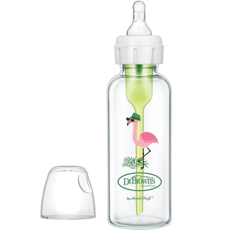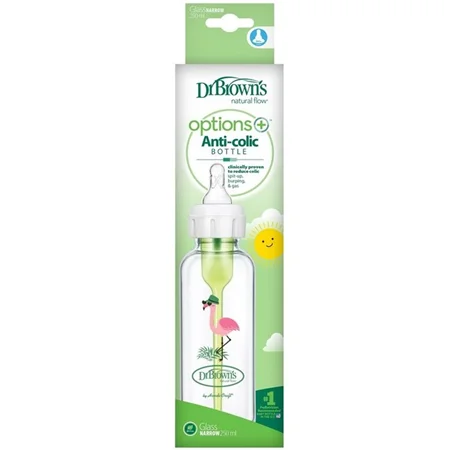 شیشه شیر پیرکس 250 میلی لیتری دکتر براونز Dr.Browns شیشه شیر های مدل آپشن پلاس دکتر براونز از جدیدترین تولیدات این برند مطرح آمریکایی است.این شیشه شیر دارای گنجایش 250 میلی لیتر و دارای سیستم ضد نفخ است و با استفاده از لوله ای که داخل شیشه شیر طراحی شده از کولیک کودک جلوگیری می کند. ویژگی شیشه شیر های آپشن پلاس دکتر براونز این است که هم می توانید شیشه شیر را با نی سبز رنگ داخل آن و هم بدون نی استفاده کرد. نی سبز رنگی که داخل شیشه شیر تعبیه شده است باعث می شود که هیچگونه جریان هوایی وارد معده نوزاد نشود و از دل درد و نفخ نوزاد جلوگیری می کند. ویژگی ها: بدنه این شیشه از جنس شیشه پیرکس بوده و دارای سرشیشه سرگرد باریک +3 ماه (level 2) سیلیکونی میباشد. بدنه و سرشیشه آن فاقد مواد شیمیایی مضر (BPA Free) میباشد. این محصول تولید شده در کارخانه برند دکتر براونز Dr Browns (واقع در کشور چین ) میباشد.