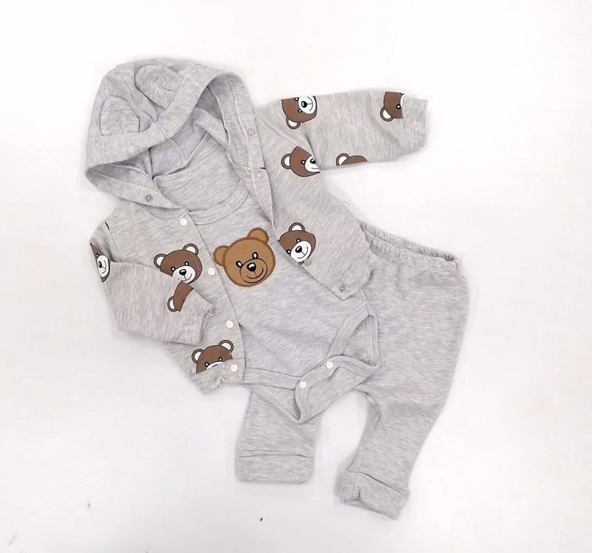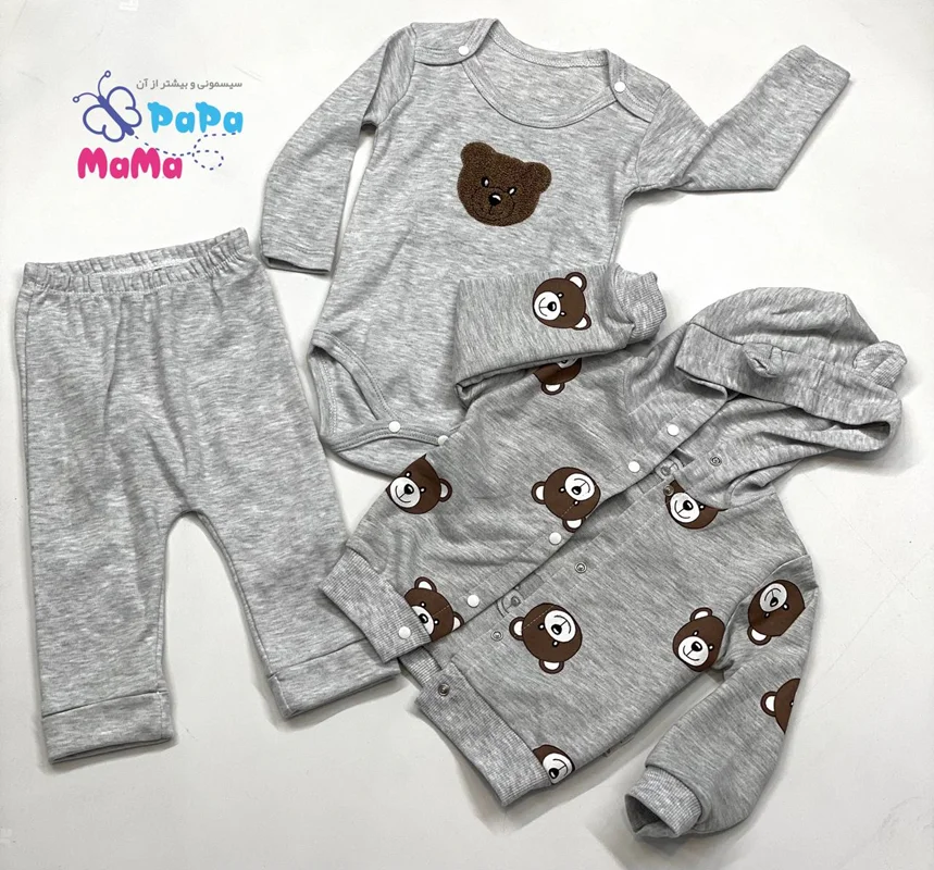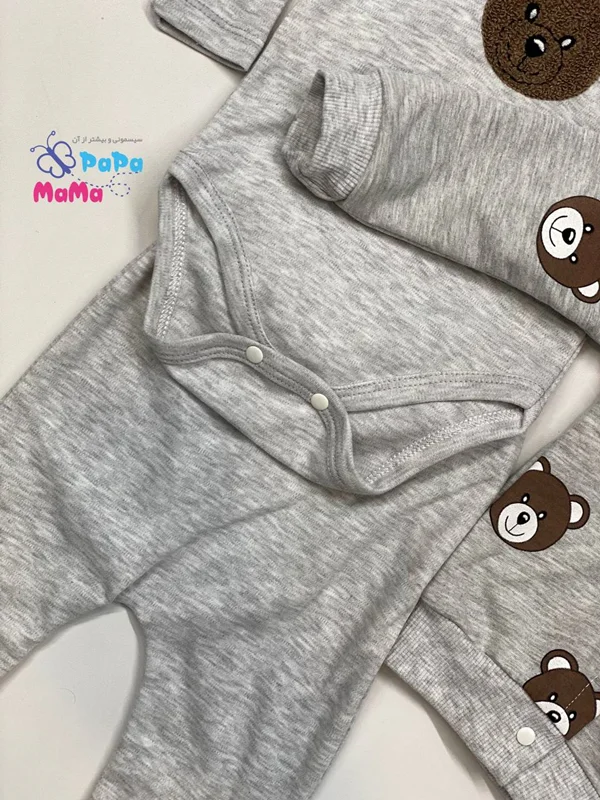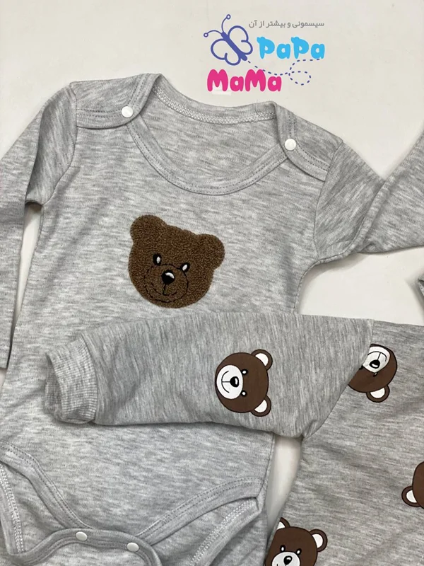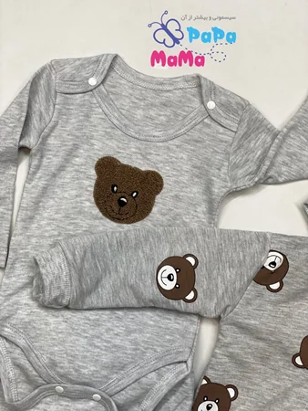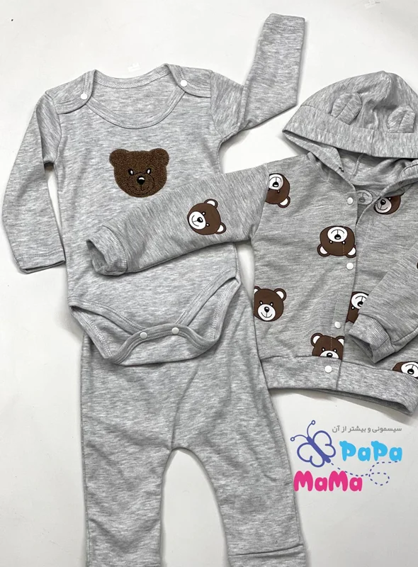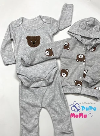 ست 3 تکه خرسی nayinom در فروشگاه ماماپاپالند(mamapapaland.ir) به صورت حضوری و اینترنتی قابل تهیه است.این ست دارای یک بادی آستین بلند یک شلوار و یک سوئیشرت است که مناسب فصل های سرد سال است. بادی این محصول دارای یک طرح گلدوزی شده خرس است که در سه سایز قابل سفارش است.