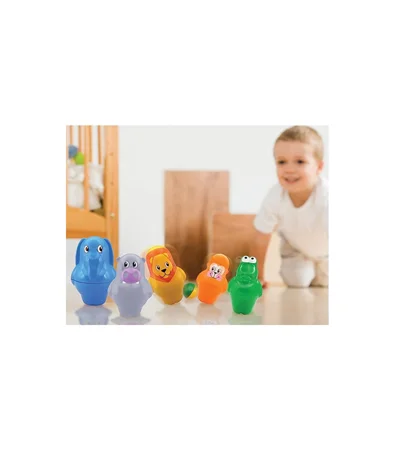 اسباب بازی بولینگ حیوانات TOLO شامل پنج حیوان جنگل با شخصیت های خنده دار، یک توپ رنگی و یک قورباغه است که در داخل هر حیوان مخفی می شود. با چیدن عروسک حیوانات و ضربه زدن به هر یک از آنها، غورباقه ای که در داخل آن مخفی شده است پیدا می شود. این اسباب بازی جنبه سرگرمی دارد و در عین حال باعث تقویت تمرکز و همکاری چشم و دست کودک دلبند شما می شود.