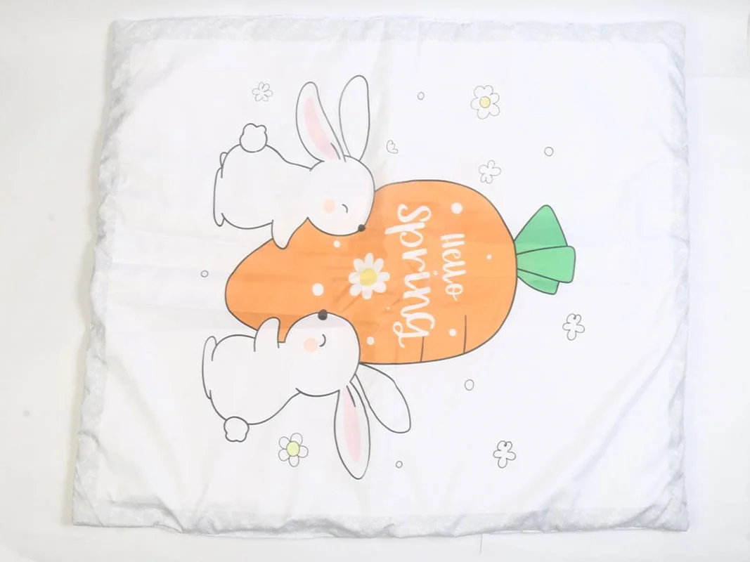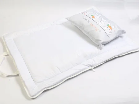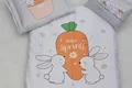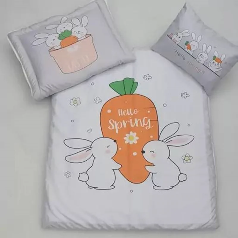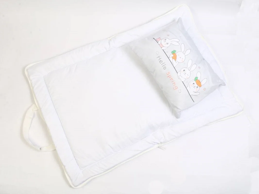 ست خواب مسافرتی نوزادی طرح خرگوش و هویج یا دم دستی نوزاد شامل یک تشک زیپدار لحاف و بالش در سایز کوچک است که به شکل یک کیف کوچک قابلیت حمل توسط مادر را دارد و به راحتی در بیرون از منزل استفاده میشود.