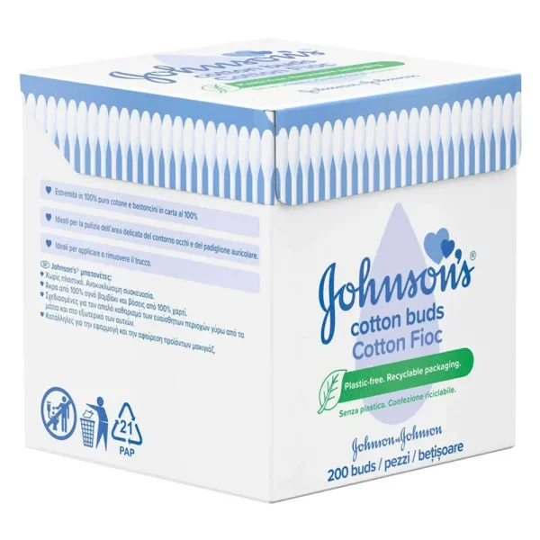 گوش پاککن JOHNSON’S Baby Cotton Buds – بسته ۲۰۰ عددی یکی از گزینههای بسیار مطمئن و بهداشتی برای استفاده روزانه است. بر اساس اطلاعات رسمی برند، نوکها از ۱۰۰٪ پنبهی خالص ساخته شدهاند و عصا یا دسته آنها از کاغذ (paper stick) هست، به این معنی که این محصول عملاً کاملاً بدون پلاستیک تولید شده است.