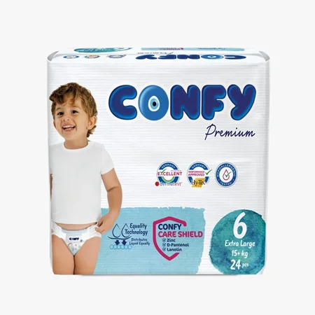 پوشک سایز 6 کانفی CONFY PREMIUM محصولی مناسب برای کودکان +15 کیلوگرم است. این پوشک توانایی جذب بسیار بالایی دارد و از تراوش نم و رطوبت به لباس نوزاد و بیرون جلوگیری میکند. این محصول متناسب با ارگونومی بدن کودک طراحی شده است و ساختار آناتومیک آن به گونهای است که به بدن نوزاد نمیچسبد و کودک به راحتی میتواند در آن جست و خیز کند.الیافی که در ساخت این محصول به کار رفته است از نوع مرغوب بوده و بسیار نرم و لطیف هستند؛ بنابراین هیچگونه حساسیت پوستی برای کودک به وجود نمیآورند و هنگام استفاده از آن لازم نیست که هیچ نگرانی بابت التهاب و قرمز شدن پای کودک و بروز بیماریهای عفونی و قارچی داشته باشید. نازکی و سبکی این محصول در کنار کیفیت بسیار بالا، آسایش و راحتی را برای فرزند دلبندتان فراهم میآورد و همین امر باعث میشود او در طول شبانه روز بدون ذرهای احساس ناراحتی از آن استفاده کند.