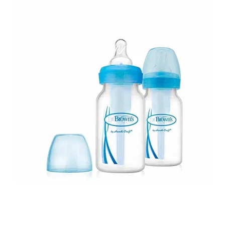 شیشه شیر طلقی دکتر براون از جنس پلی پروپلین ساخته شده و سری سیلیکونی گرد و نرم دارد. طراحی گرد این سرشیشه ها به این منظور صورت گرفته تا نوزاد هیچ گونه تفاوتی بین آن و سینه مادر احساس نکند. جنس بدنه شیشه شیر۲ عددی طلقی+Options دکتر براون 120 میل آبی به گونه ای است که مواد مغذی شیر را۲۰ دقیقه در خود حفظ می کنند و مانع از جذب ویتامینها و مواد مفید به بدنه شیشه می گردد.رنگ این پک دو عددی آبی بوده و بیشتر مناسب انتخاب برای نوزادان پسر می باشد.شیشه شیر۲ عددی طلقی+Options دکتر براون 120 میل آبی نیز مانند تمامی محصولات باکیفیت این برند معتبر آمریکایی فاقد BPA و مواد مضر شیمیایی می باشد تا با خیالی آسوده بتوان آن را در فرآیند تغذیه کودک به کار گرفت. نکته جالب توجه این محصول تعبیه یک لوله آنتی کولیک است که احتمال هر گونه دل درد و نفخ کودک را از میان می برد. این محصول با حجم 120میلی لیتر دارای درجه بندی و درب محافظ می باشد.