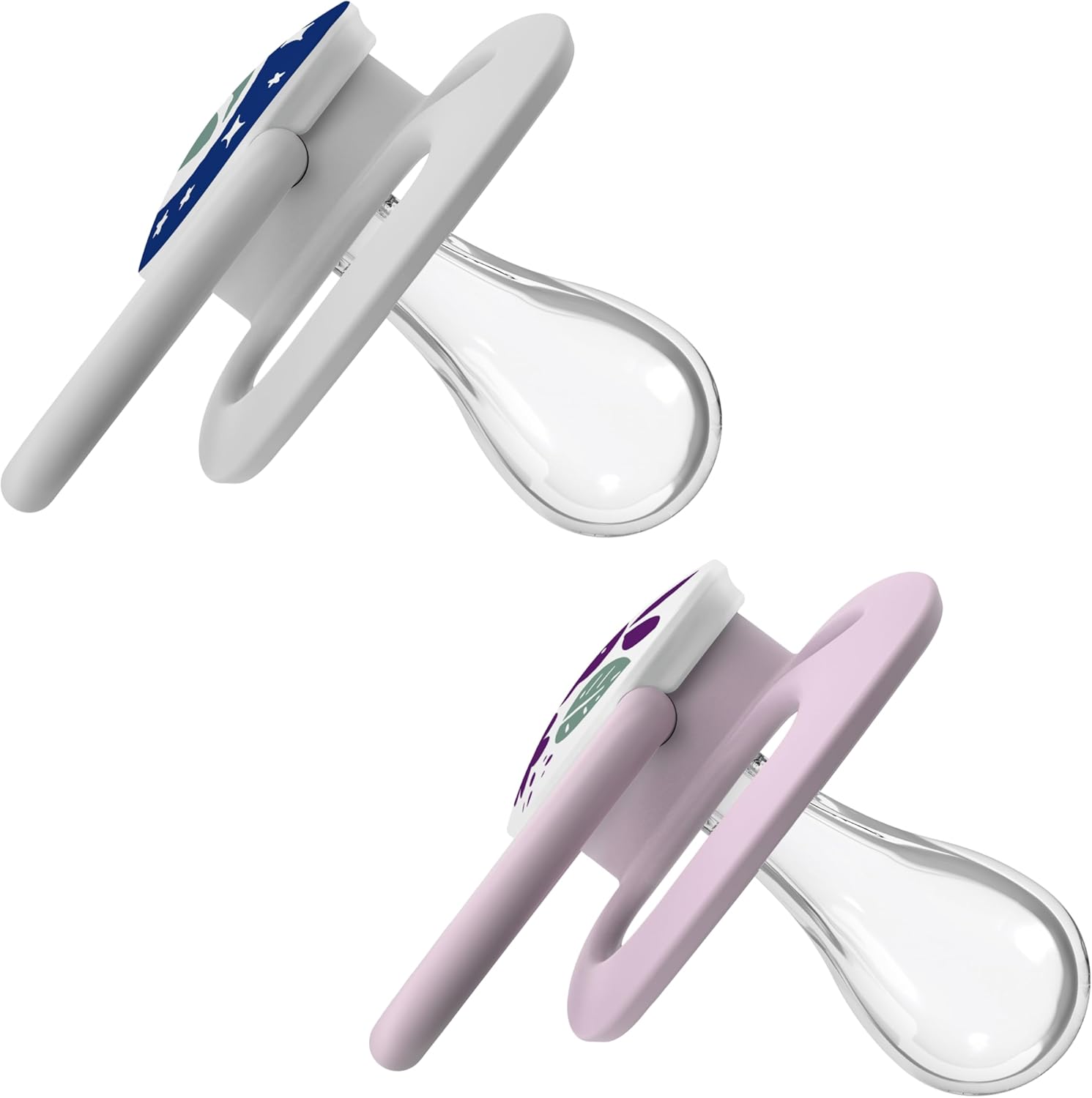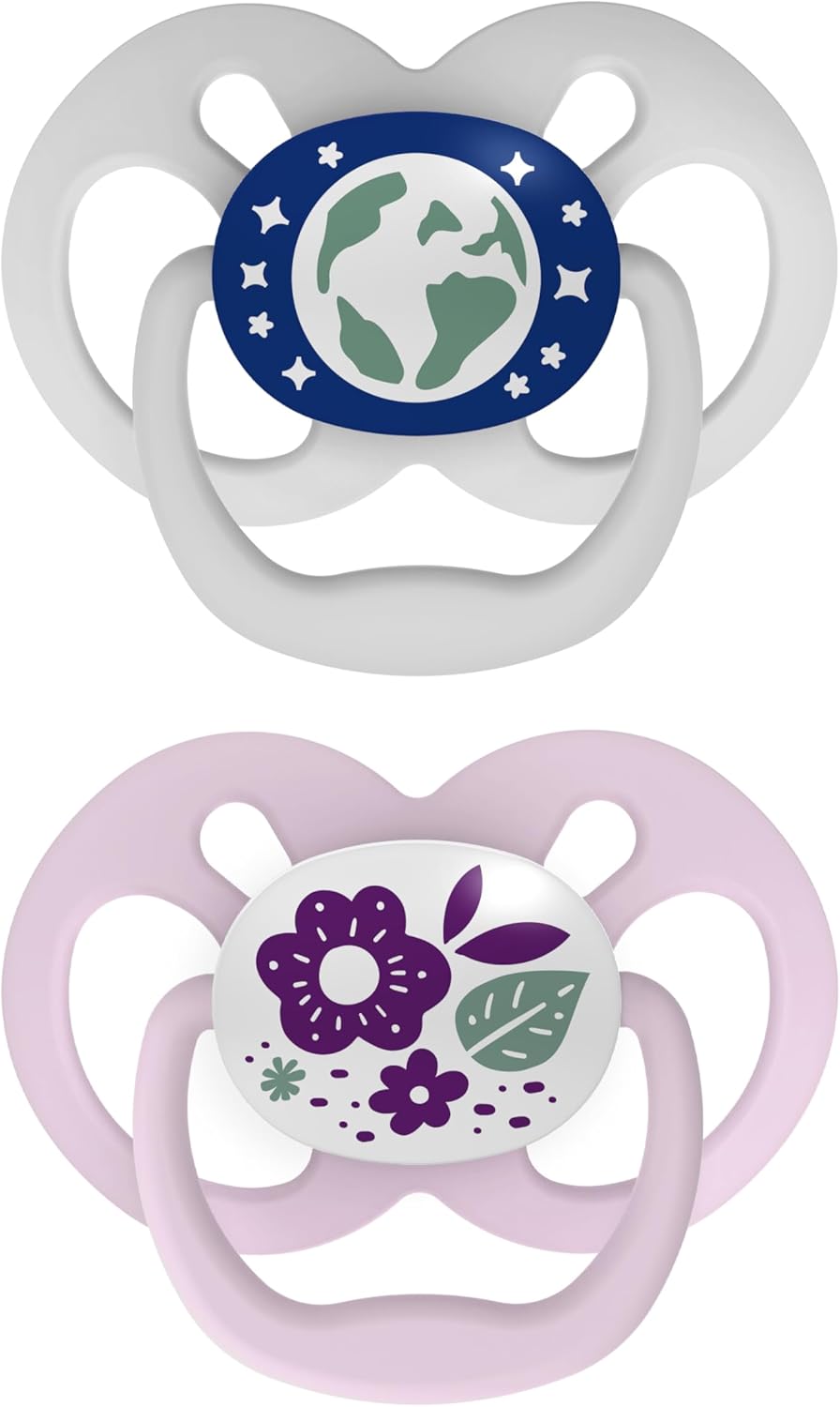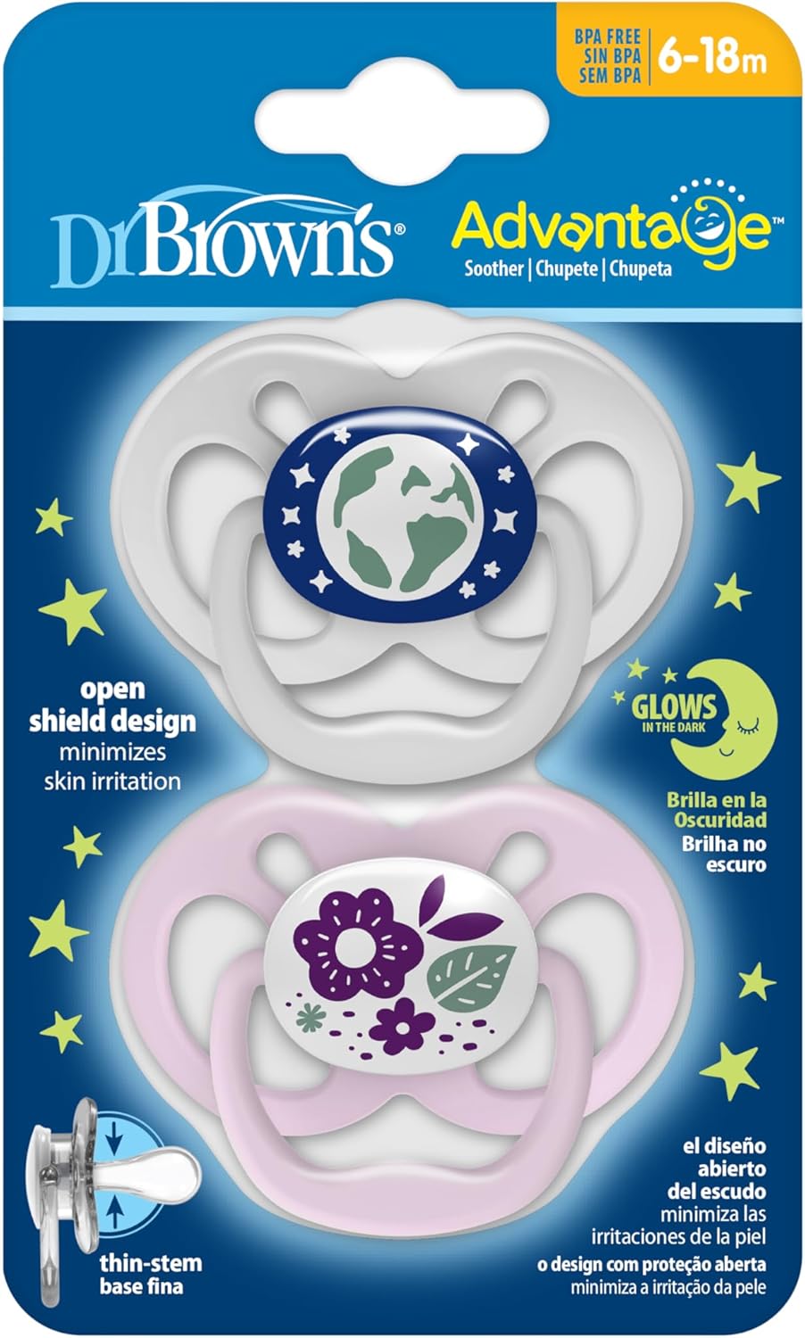 پستانک 2 عددی دکتر براونز Dr.Browns مناسب با ساختار دهان کودکان 6 تا 18 ماه میباشد تا هیچ گونه آسیبی به فرم طبیعی فک کودک وارد نشود.همچنین سری آن از جنس سیلیکونی بسیار نرم می باشد که هیچ گونه لطمه ای به لثه های حساس و دندان های تازه روییده شده نوزاد وارد نگردد.محفظه نگهدارنده این پستانک ها به گونه ای طراحی شده که از آلوده شدن پستانک ها جلو گیری کرده و وجود حفره های روی درب باعث جریان هوا میشود و از ایجاد حساسیت نوزاد به پستانک جلوگیری می نماید .