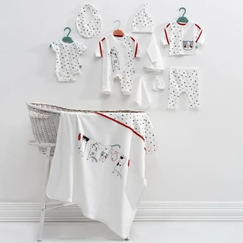 این ست شامل سرهمی جوراب دار، زیردکمه رکابی، شلوار، مانتو، دوبل آستین بلند، کلاه، پیشبند، دستکش، دستمال و یک پتوی دورپیچ نوزاد است.